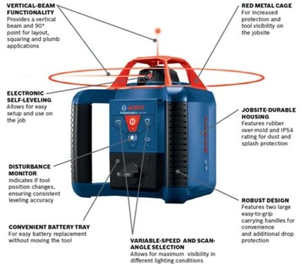 The Bosch Self-Leveling Rotary Laser Kit delivers a solution for outdoor and indoor leveling. It features a horizontal/vertical self-leveling laser, suitable for leveling, aligning, and squaring applications.